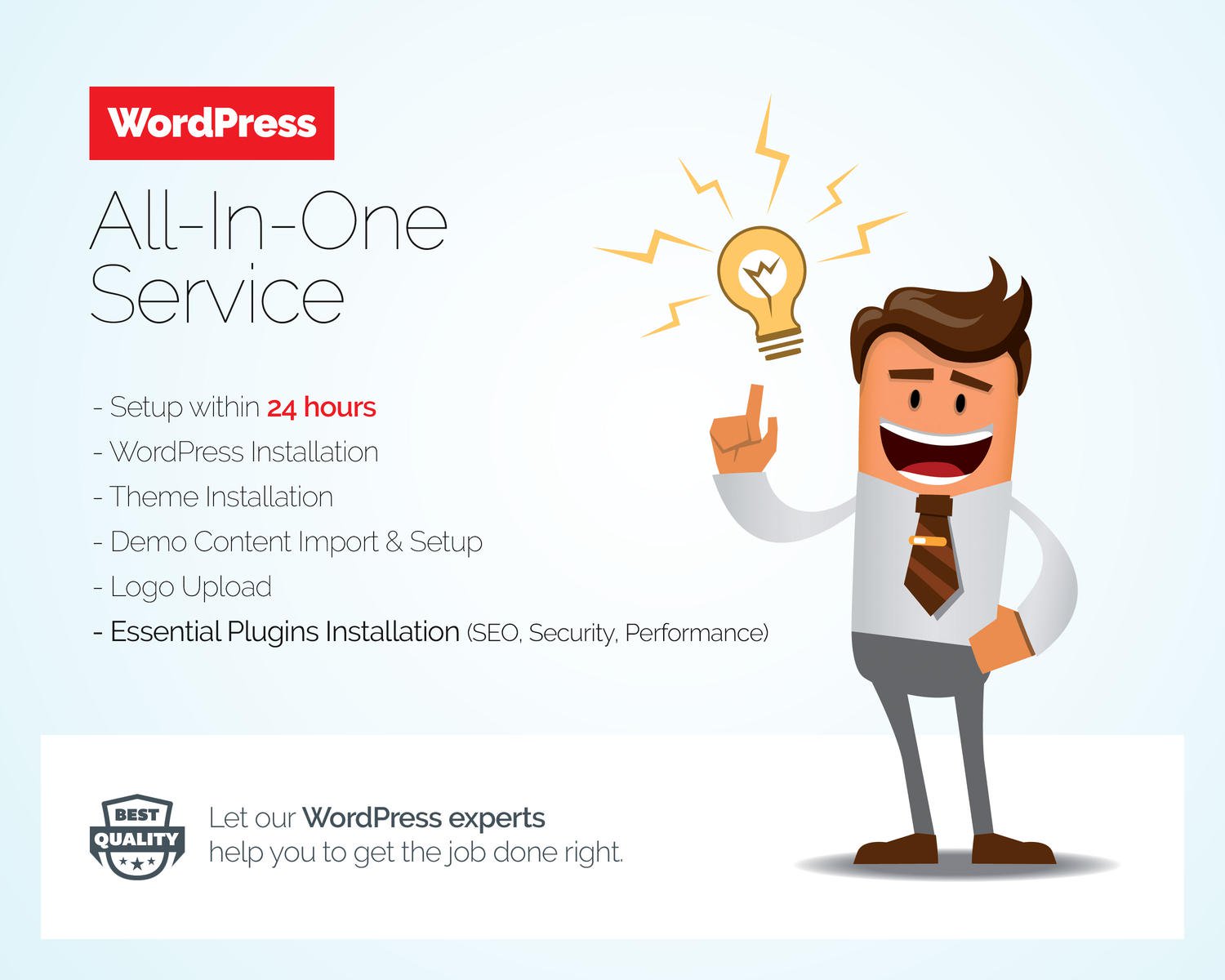 With our Express WordPress Installation service we will manually install WordPress, your WordPress theme and the demo content and will help you to get your website up and running to look exactly like the theme's demo website. In addition, we will setup the theme options and add your logo — saving you potentially hours of work!